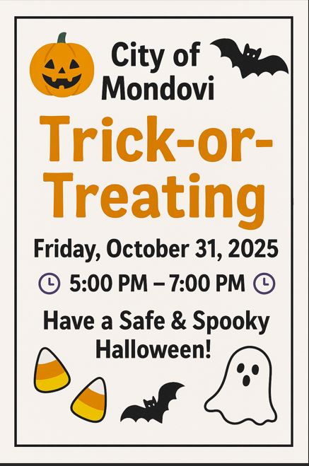 Hours for Trick-or-Treating in the City of Mondovi will be Friday, October 31st from 5:00 pm to 7:00 pm. If you plan on participating, please leave your porch lights on so the ghosts and gobblins know they can stop for treats. Please be safe and be cautious of parents and children walking from house to house.